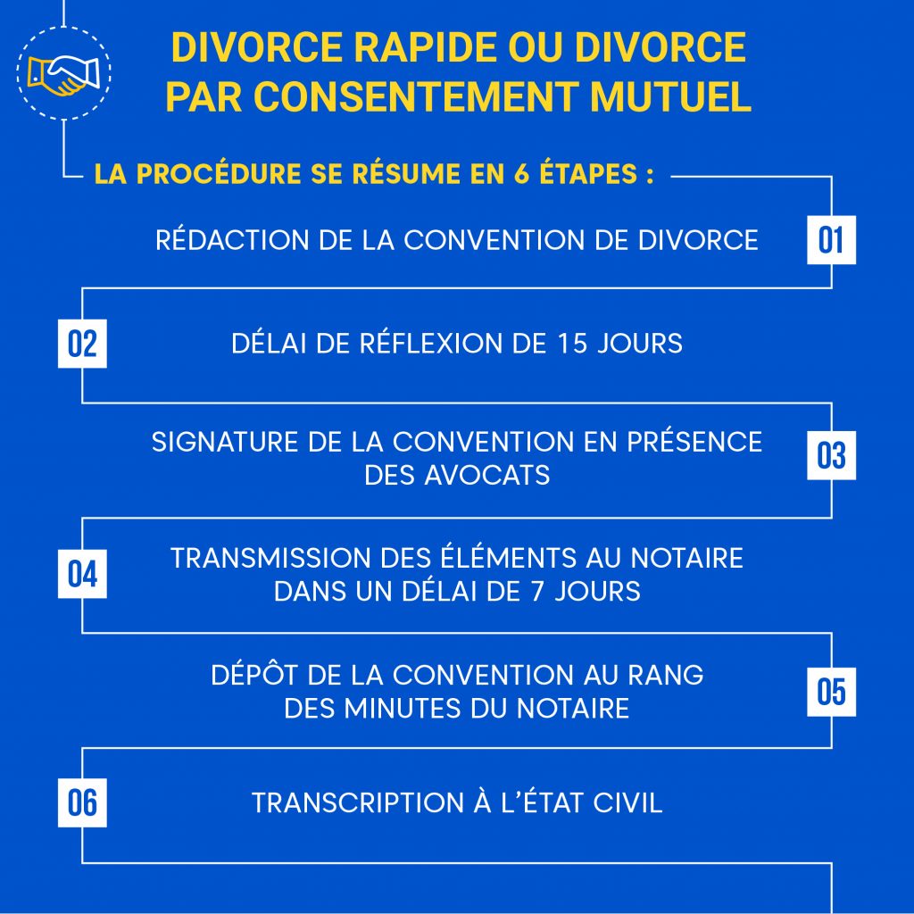 Voici une infographie qui résume en 6 étapes la procédure de divorce par consentement mutuel :