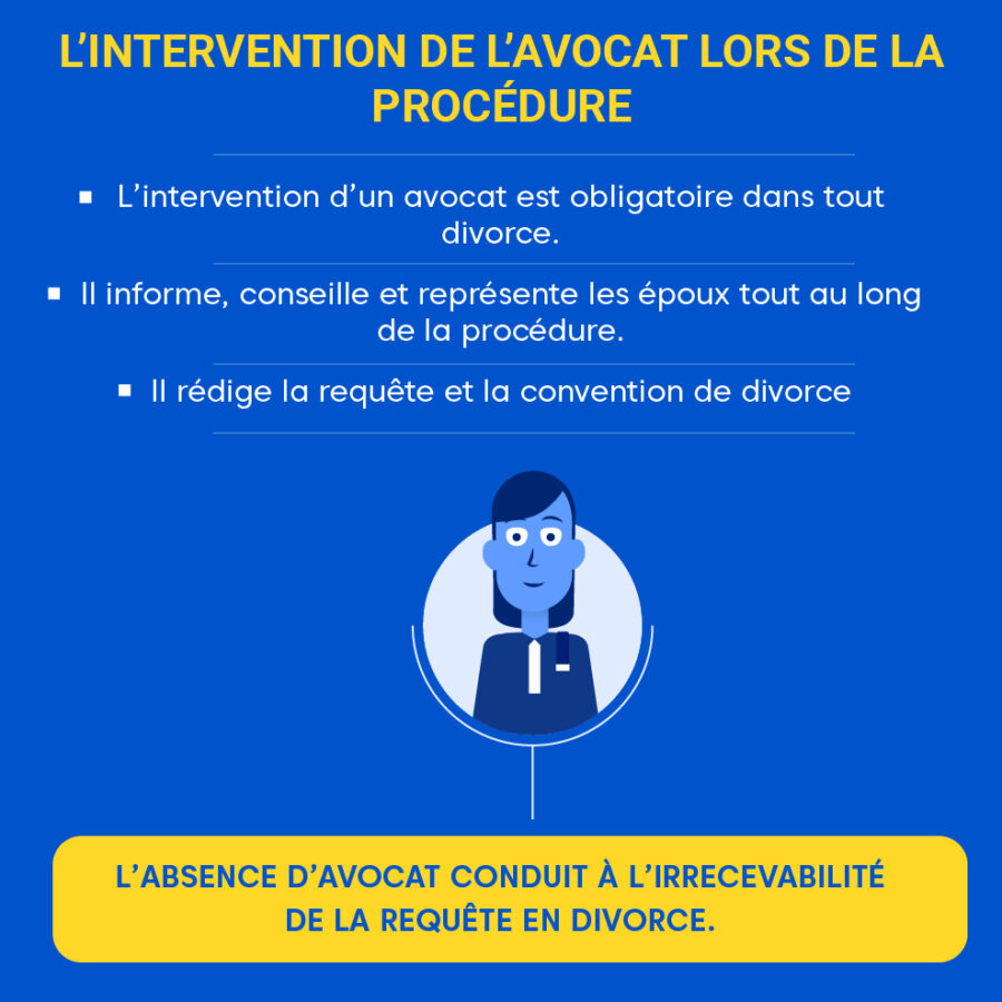 - Choix d’un avocat, car chaque époux doit en avoir un ;