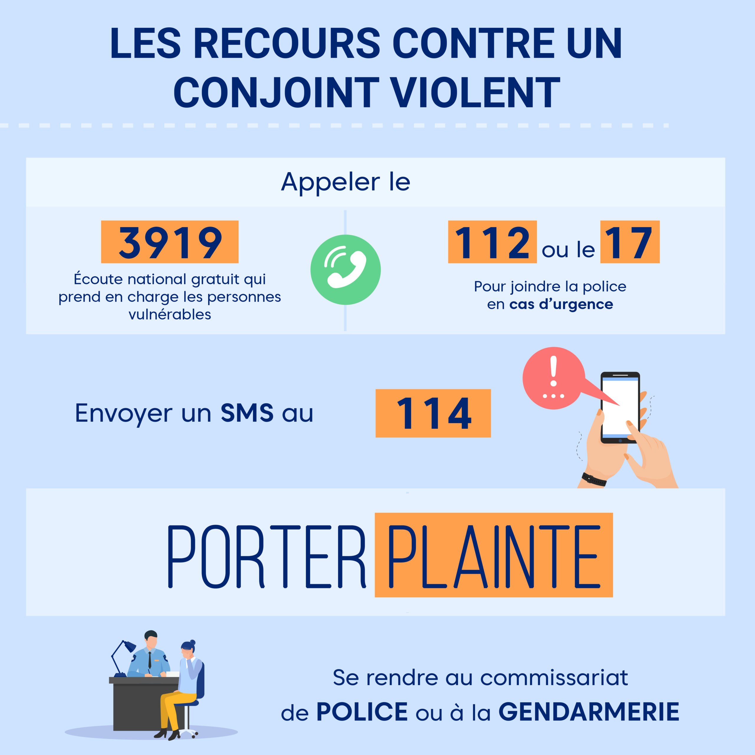 - Appeler le 3919 (Violences Femmes Info, gratuit et anonyme, 24h/24 et 7j/7), qui prend en charge les personnes vulnérables, en situation de précarité, les femmes en situation de handicap et non francophones ;