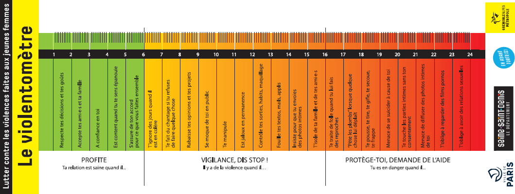 En complément de notre infographie sur les différentes formes de violences conjugales, nous vous proposons également le Violentomètre, disponible sur le site La Maison pour l’égalité femmes-hommes : un outil simple, visuel et reconnu, qui permet à chacun-e d’évaluer si sa relation amoureuse est basée sur le respect ou présente des signes de violence, même insidieuse.