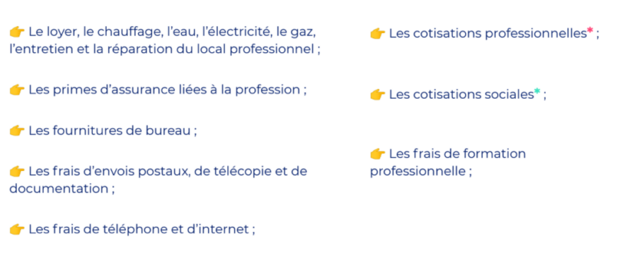 • Le loyer, le chauffage, l’eau, l’électricité, le gaz, l’entretien et la réparation du local professionnel.