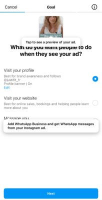 Il suffit de sélectionner le bouton bleu Boost sur le post désiré. Instagram propose ensuite de définir l’objectif de la campagne, offrant trois choix principaux : augmenter les visites de profil, le trafic vers un site web, ou stimuler les interactions par messages, y compris via WhatsApp.